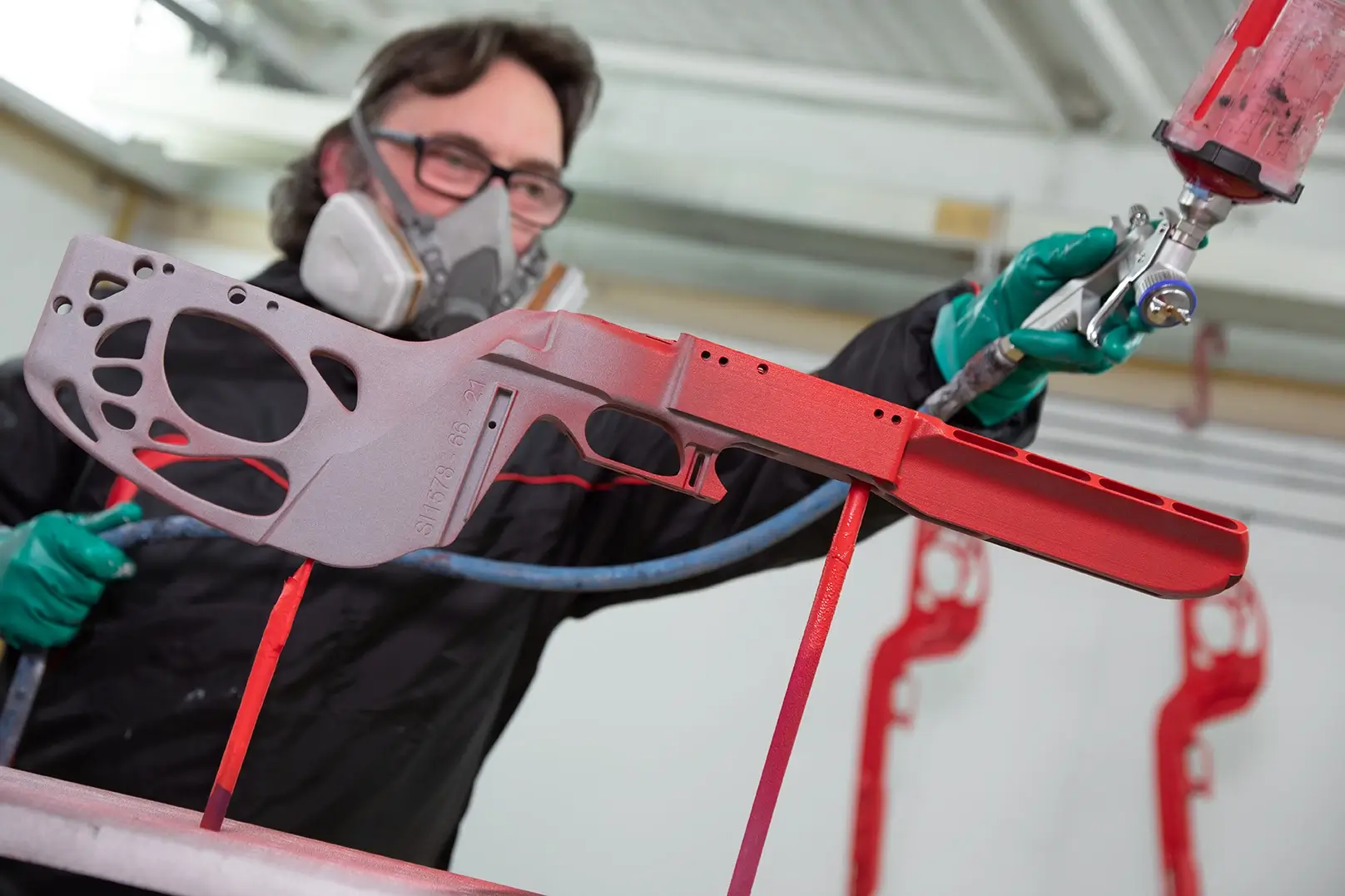 Nach der Vorbehandlung kommen die 3D-Druck-Kunststoffteile in die oberflächentechnische Fertigbearbeitung und Veredelung. Beim 3D-Druck-Finishing stehen unseren Kunden vielfältige mechanische und beschichtungstechnische Verfahren zur Verfügung, um den lasergesinterten Kunststoffteilen die gewünschte Oberfläche zu geben.