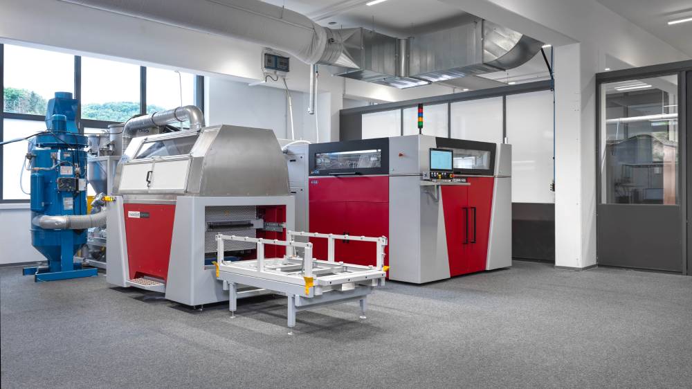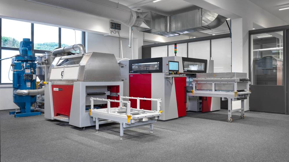 Die VX1000 HSS von voxeljet arbeitet mit High Speed Sintering. Die Maschine bietet eine hohe Produktionsgeschwindigkeit bei gleichzeitig guter Maßhaltigkeit und ist ideal für funktionale Prototypen und Kleinserien. Sie verarbeitet vor allem PA12 und ermöglicht eine effiziente Herstellung großer Bauteile oder Baujobfüllungen.