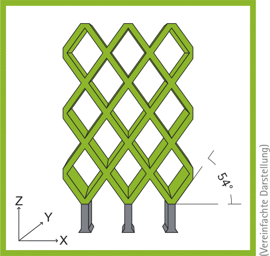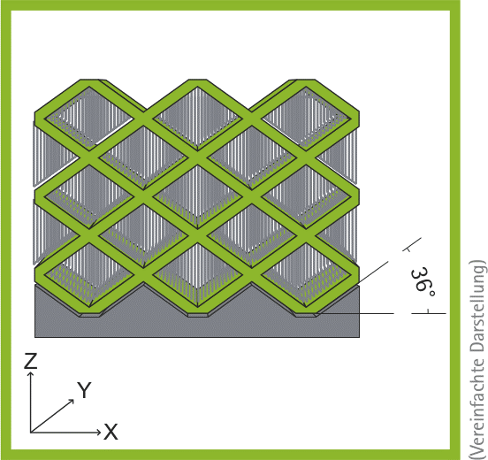 Des Weiteren wird Stützgeometrie an Stellen benötigt, an denen eine Kontur nicht auf einer vorherigen Kontur (also ins lose Pulverbett) aufgeschmolzen wird oder der zu belichtende Bereich sehr stark (>45° oder Radius >3 mm) von der vorherigen Schicht abweicht. Die Supportstruktur ist in den meisten Fällen eine wabenförmige Struktur mit kleinstmöglicher Wandstärke, die sich im äußeren Bauteilbereich leicht von Hand entfernen lässt.